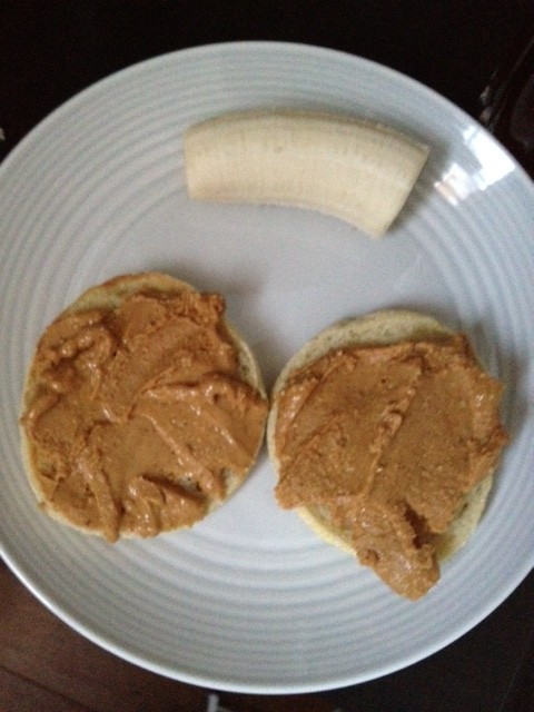 Breakfast this morning was another english muffin with peanut butter and a half banana