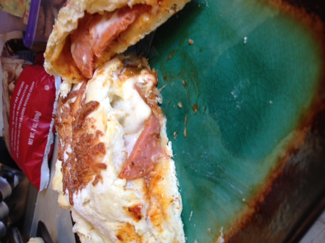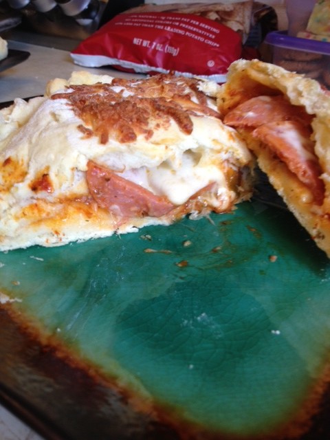 Half the dough. For each ball, knead and stretch out to about a 10″ diameter (like a pizza). Add sauce, fillers of choice (I used zucchini, red peppers, pepperoni and mozzarella) to one half the dough. Fold the other side over the fillings. Take a fork and press the ends together to make sure the pie is sealed. Top with cheese (optional) Bake at 350 degrees for 25-30 minutes