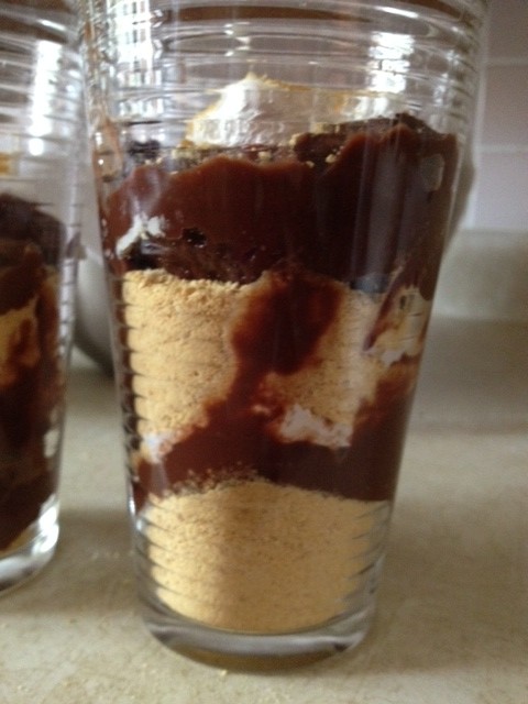 I made Jell-o cook and serve chocolate pudding (with almond milk). After it was chilled in the fridge for a few hours, I layered it with marshmallow fluff and graham cracker crumbs. Not gorgeous, but delicious!