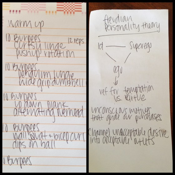 I am frugal in my paper consumption, so I used the back side of my workout to take notes on the Freudian Personality Theory. Because that’s normal. Whatever, I got to write about marketing sports cars and fine chocolates.