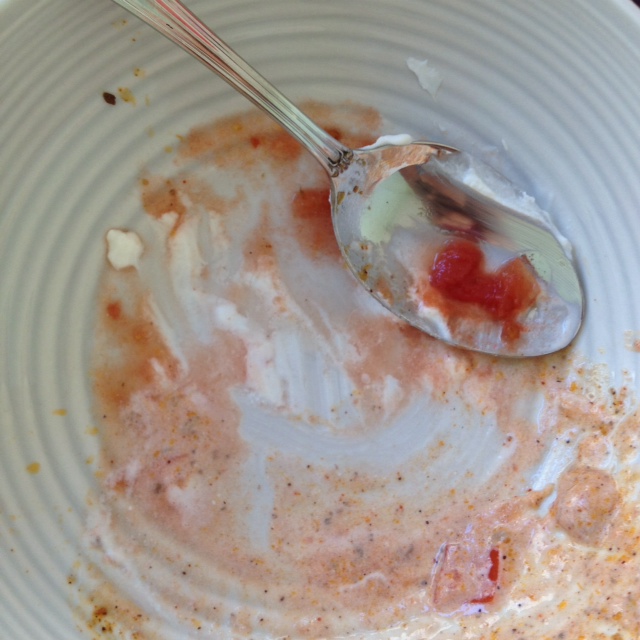 Lunch: Plain 0% Greek yogurt, salsa and a dash of taco seasoning (eaten with blue corn organic tortilla chips)