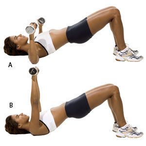 Except, I had the class rest their heels on their steps. I also had them alternate between the chest press and flys 2 times- without coming out of the bridge pose. Then had them go immediately into weighted bridge dips and single leg dips. Bwahaha