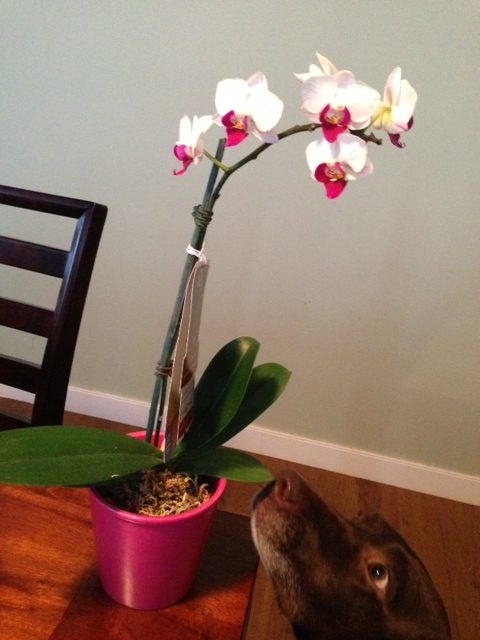 Tyler brought me home a flower that’s hard to kill! How thoughtful. No seriously, I squealed with excitement. And Layla sniffed like crazy.