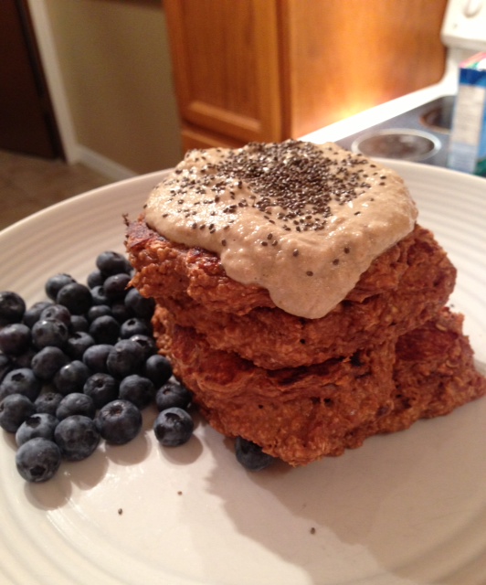 I topped mine with sunflower seed frosting (a mixture of my homemade sunflower seed butter and almond milk, heated in the microwave and stirred well) and some chia seeds. With a side of blueberries.