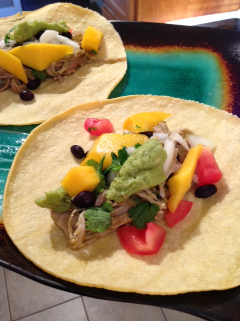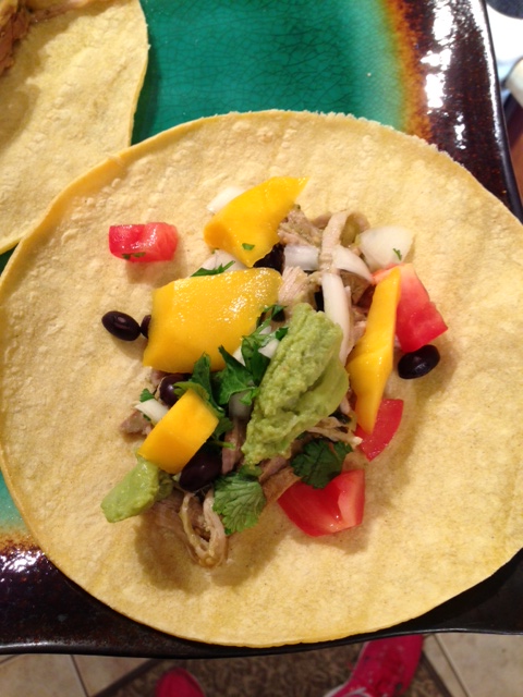 4. Assemble your tacos. I used corn tortillas, the pulled pork, extra onions/cilantro, diced tomatoes, mango, black beans, and guac.