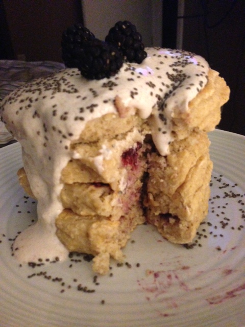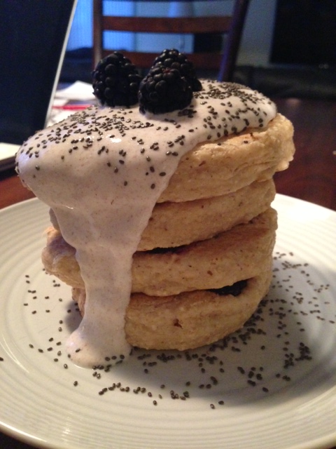 Mix everything together, pour on hot griddle (with cooking spray), top with sliced blackberries, flip, eat. These came out SUPER fluffy and they were nice and filling. I topped the stack with a mixture of greek yogurt, almond milk, cinnamon and agave. Oh, and chia seeds.