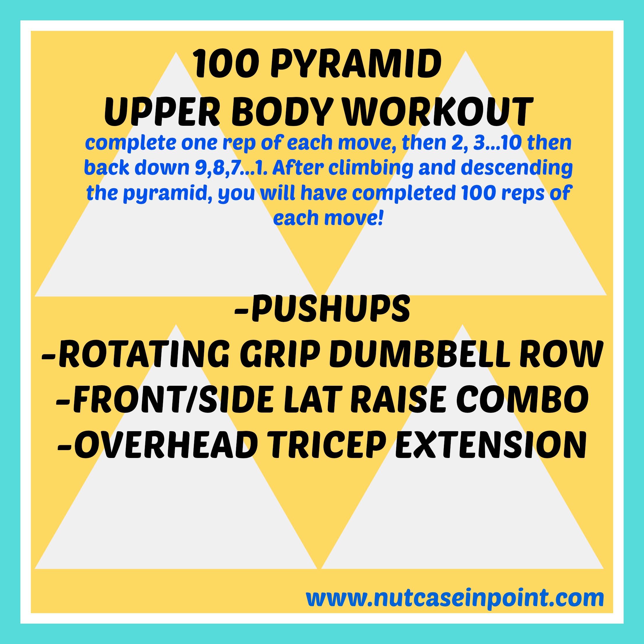 I love pyramid workouts since you have something to countdown. I’ll have to give this one a try. I will definitely need to start with lower weights since my upper body is weaaaakkkkk.