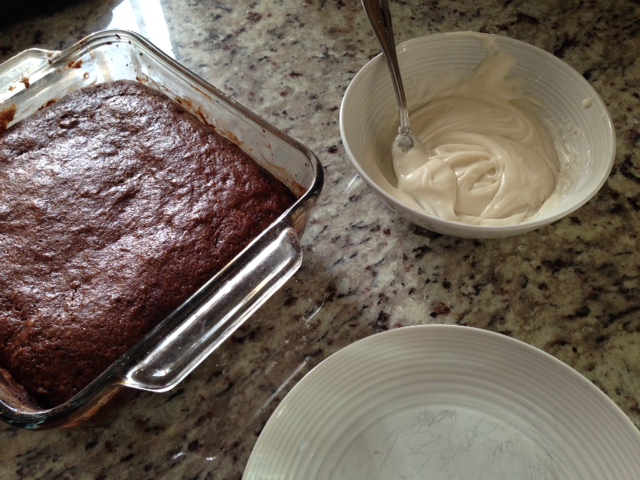…baked a cake! I know I only have a week until my mom gets here to bake my birthday cake, but I had it on my mind so it had to be done. And I didn’t even wait for it to cool 5 minutes before cutting out a chunk and slathering it with icing.