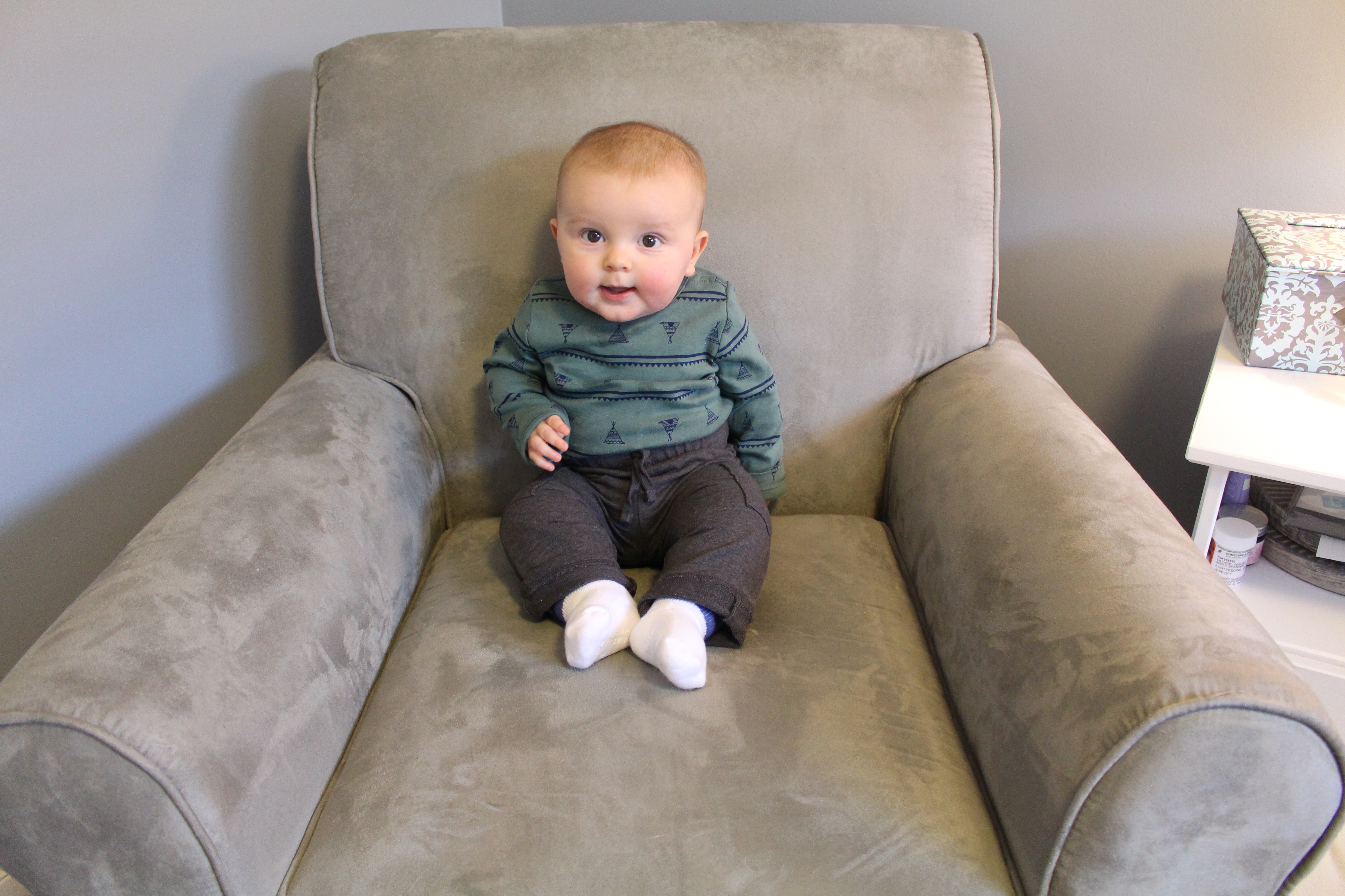 He is OBSESSED with his jumperoo. I think he spends a cumulative 3 hours each day in that thing. He loves to rotate from activity to activity and just jump. Jump. JUMP. A lot of the time, he jumps himself to sleep! It’s also a nice distraction for him when I want to get my workout in during the day.