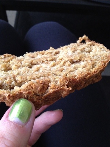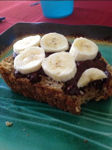 Spinach topped with cooked sweet potato and onion poppyseed dressing. Then, a piece of beer bread topped with melted chocolate chips and banana slices