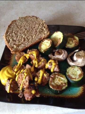 Yup, it was good. Too bad I had two slices of this stuff before dinner. No carbs to be had on my dinner plate! But for Tyler’s sake, I whipped up some chicken sausage with roasted mushies and zucchini to accompany the bread.