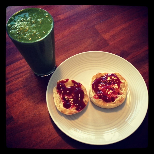 It included: 1 frozen banana, 2 handfuls spinach, orange juice, frozen raspberries, Oikos Greek yogurt, and 2 medjool dates. Totally delicious.