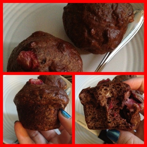 Bfast this morning was a batch of chocolate strawberry protein muffins. I got the idea from meals & moves. I substituted vanilla protein powder for chocolate, used all plain nonfat Greek yogurt and strawberries instead of peaches. They turned out pretty good!