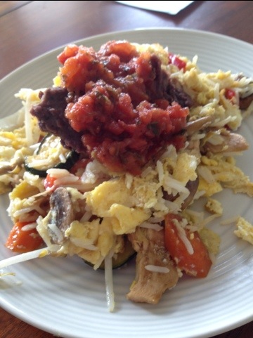 I mixed some of the leftover stir fry with some scrambled eggs and topped with black beans and salsa. Tummy= satisfied.