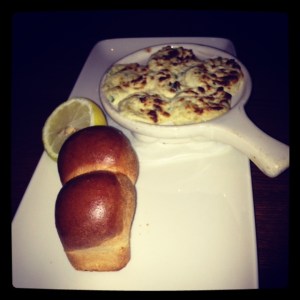 For an app, we had Mushrooms Neptune. They are mushrooms filled with crab and cream cheese. I don’t know why it was accompanied with a butt role, since we already were served a loaf of fresh baked bread. Delicious, nonetheless.