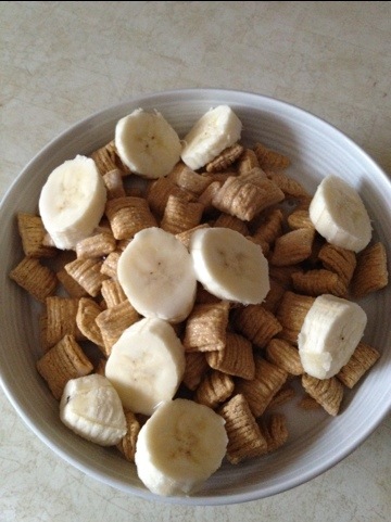 Now, today… Ugh. Such barfy weather. But I rallied and had a nice bfast of Quaker Oatmeal Squares w/sliced banana and almond milk.