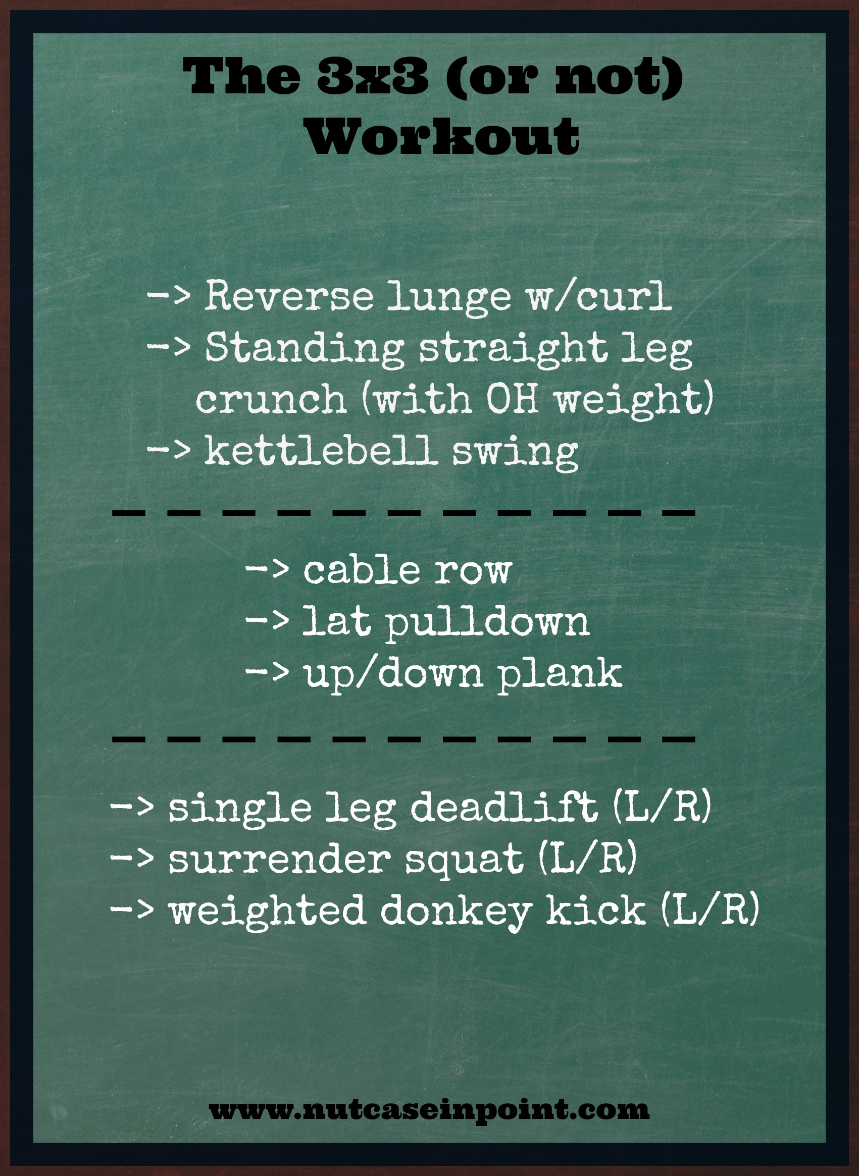 So, to give you a bit of info about this workout: there are three sets of three exercises (first set are compound exercises, second set focus on upper body, and third set focus on lower body). When I wrote up the workout, I originally decided on completing 50 reps of each move.  Then I thought maybe I’d nix that and attempt rounds to fatigue of each set before moving to the next. I finally went with lumping the 9 moves together and moving through the list, completing 10 reps of each at a time. I managed to get through it 4 times before hopping on the treadmill to finish off with some intervals before it was time to get back to work.